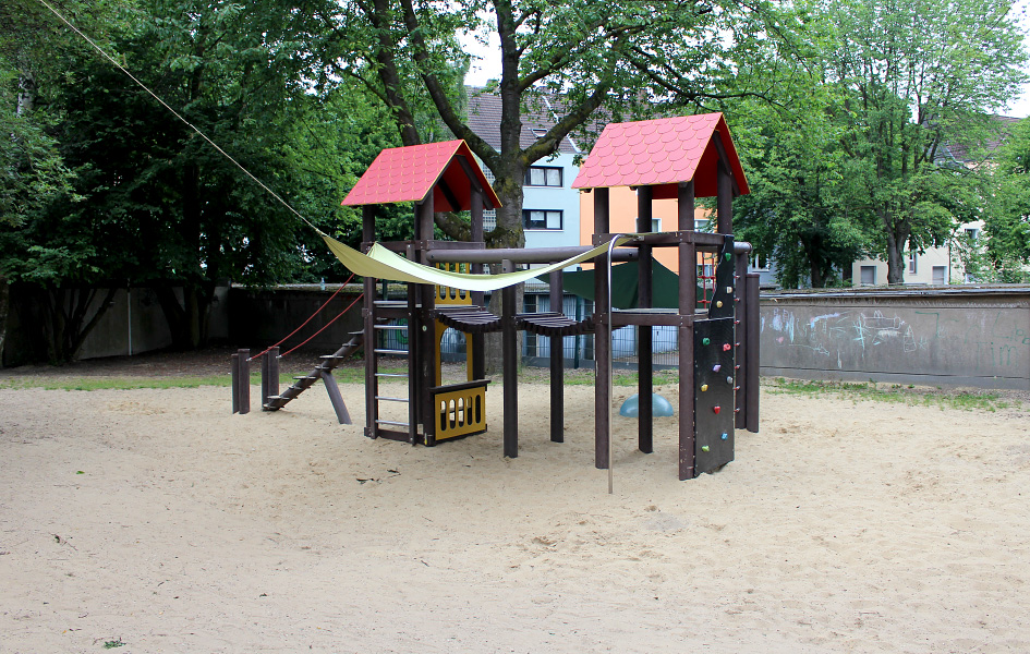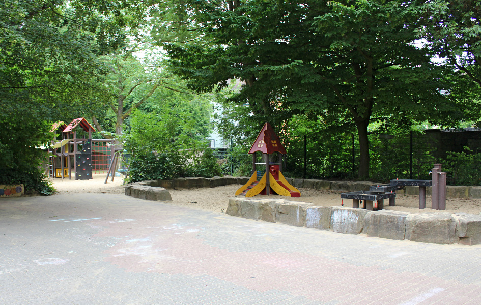 Unsere Kita verfügt – trotz der innerstädtischen Lage – über einen großen, grünen Außenbereich mit Spiel- bzw. Fußballwiese, Matschberg, Schaukeln, Klettergerüst, Sandkasten u. v. m. Für unsere U3-Kinder ist vor dem Kita-Gebäude ein ganz neuer Spielplatz mit Schaukel, Rutsche und Kletterburg entstanden, auf dem sich besonders unsere „Kleinen“ austoben können.