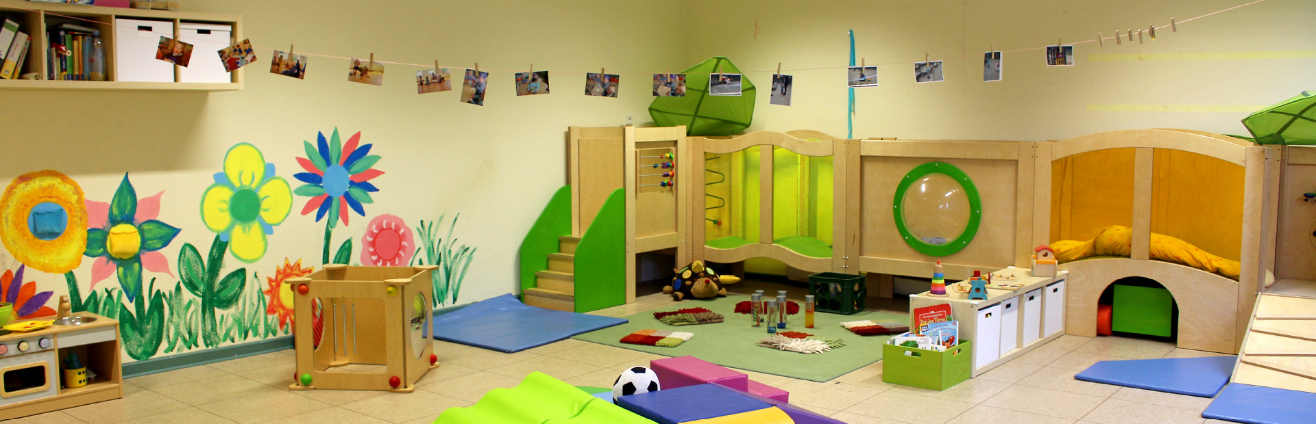 Unsere „Zwergenbande“ hat ihr eigenes „Reich“: zwei große Gruppenräume, eine eigene Caféteria, ein Kreativbereich, Räume zum Spielen, Toben und Entdecken sowie zwei Ruhe- und Schlafräume. Hinzu kommt ein großzügiger Waschbereich mit Wickeltischen.